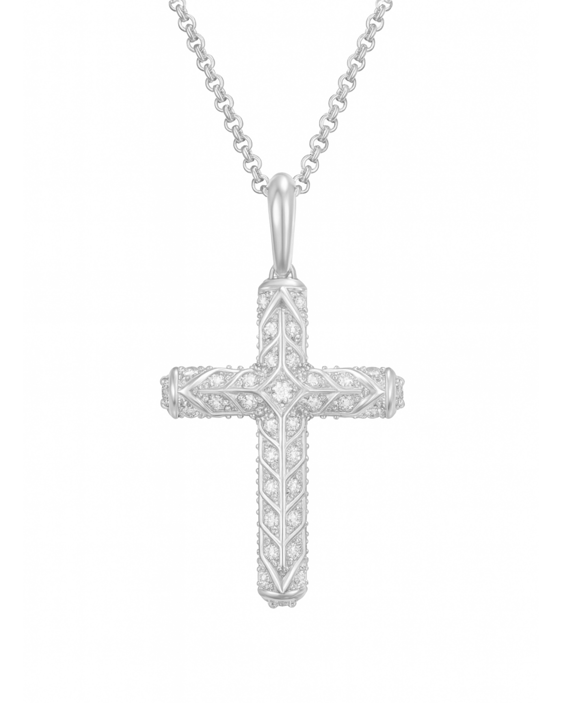 Crafted from genuine 925 sterling silver, this cross pendant is elegantly adorned with sparkling VVS moissanite stones. The intricate detailing adds depth and refinement, while the durable silver chain ensures both comfort and longevity. Combining timeless faith symbolism with premium materials, this piece is designed to shine with brilliance and remain a lasting treasure.