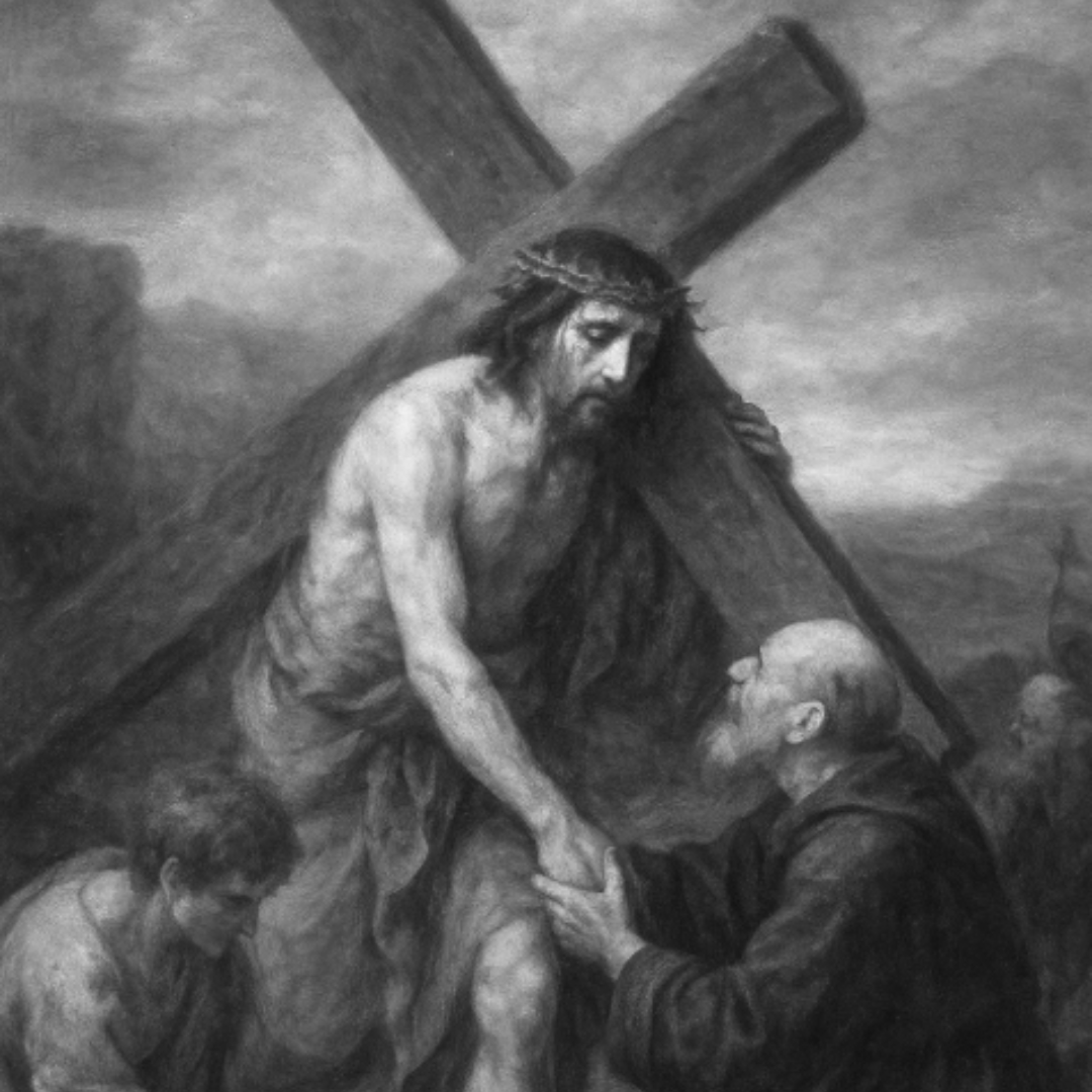 Christ, bent beneath the cross, moving forward step by step — every glance, every breath carrying the weight of humanity. It is a moment of suffering, yet also of immeasurable love.